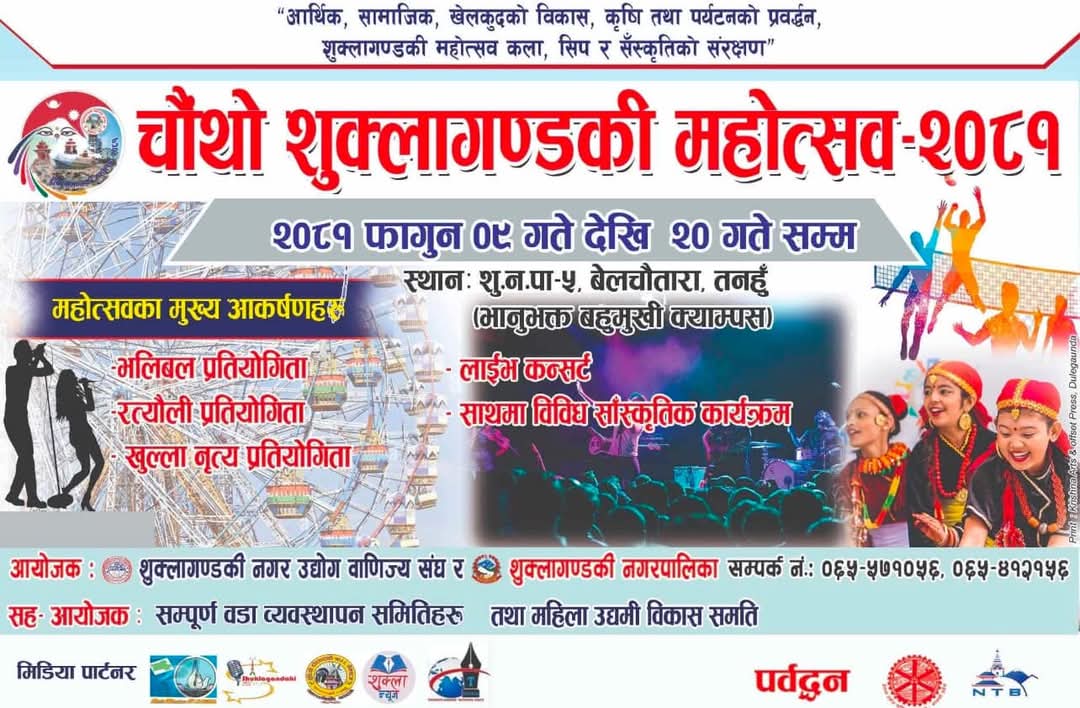 तनहुँ । तनहुँ शुक्लाण्डकी नगरपालिकाको शुक्लागण्डकी नगर उद्योग वाणिज्य संघले आयोजना गरेको चौथो शुक्लागण्डकी महोत्सवको तयारी पुरा भएको छ । शुक्रवार शुरु हुने महोत्सवको पूर्व मन्त्री एवम् तनहुँ क्षेत्र नं. २ का प्रतिनिधी सभा सदस्य शंकर भण्डारीले उद्घाटन गर्ने कार्यक्रम छ ।