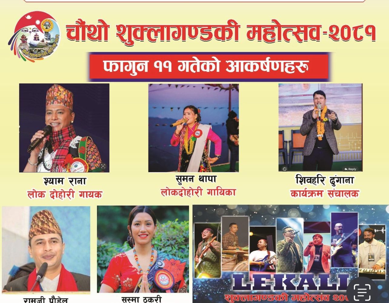 तनहुँ । ११ फागुन । तनहुँको शुक्लागण्डकी–५ बेलचौतारामा जारी चौथो शुक्लागण्डकी महोत्सवमा आज चर्चित लोकदोहोरी गायक श्याम राना लगायतले प्रस्तुती राख्ने भएका छन् । रानासँगै लोकदोहोरी गायक रामजी पौडेल, सुमन थापा र शुश्मा ठकुरीले दर्शकलाई नचाउने कलाकार व्यवस्थापन समितिका संयोजक सुमन सापकोटाले जानकारी दिए ।