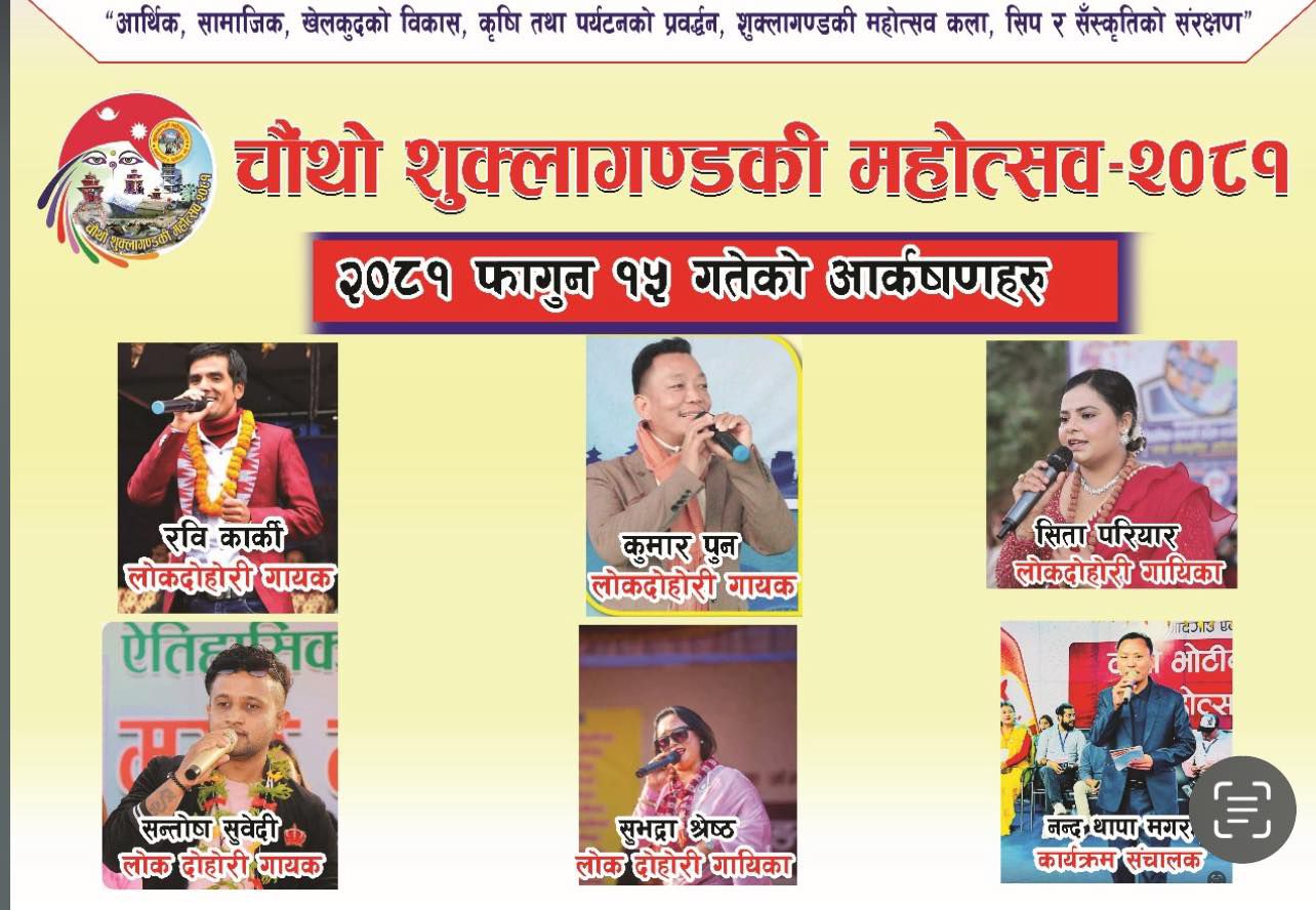 दुलेगौंडा, १५ फागुन । तनहुँको शुक्लागण्डकी–५ बेलचौतारामा जारी चौथो शुक्लागण्डकी महोत्सवमा आज पनि चर्चित लोकदोहोरी गायक गायिकाले प्रस्तुती राख्ने भएका छन् । फागुन ९ गते देखि जारी महोत्सवमा आज गायक रवि कार्की, कुमार पुन, सन्तोष सुवेदी, सिता परियार, सुभद्रा श्रेष्ठ लगायतले प्रस्तुती राख्ने कलाकार व्यवस्थापन समितिका संयोजक सुमन सापकोटाले जानकारी दिए ।