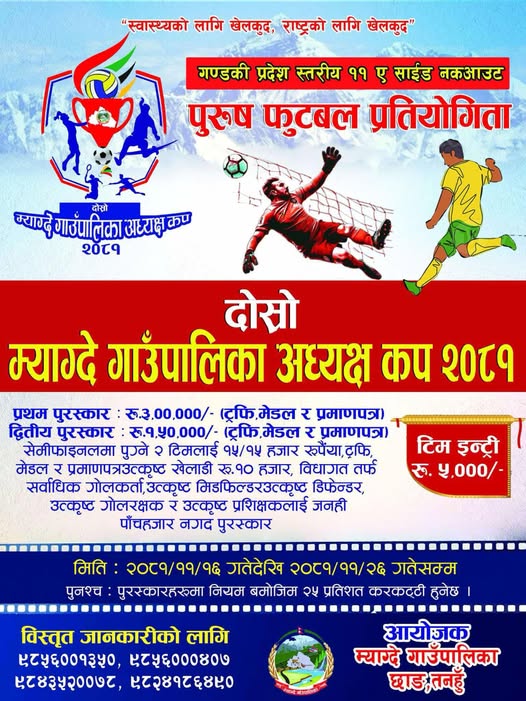 म्याग्दे गाउँपालिका वडा नं ५ छाङ्ग पाटनमा हुने फुटवल प्रतियोगितामा प्रथम पुरस्कार ३ लाख, ट्रफी, मेडल र प्रमाण -पत्र, द्धितीय पुरस्कार १,लाख ५० हजार ट्रफी, मेडल र प्रमाण-पत्र,र सेमीफाइनल पुग्ने २ टिमलाई १५/१५ हजार रुपैयाँ, ट्रफी, मेडल र प्रमाण-पत्र प्रदान गरिनेछ ।
