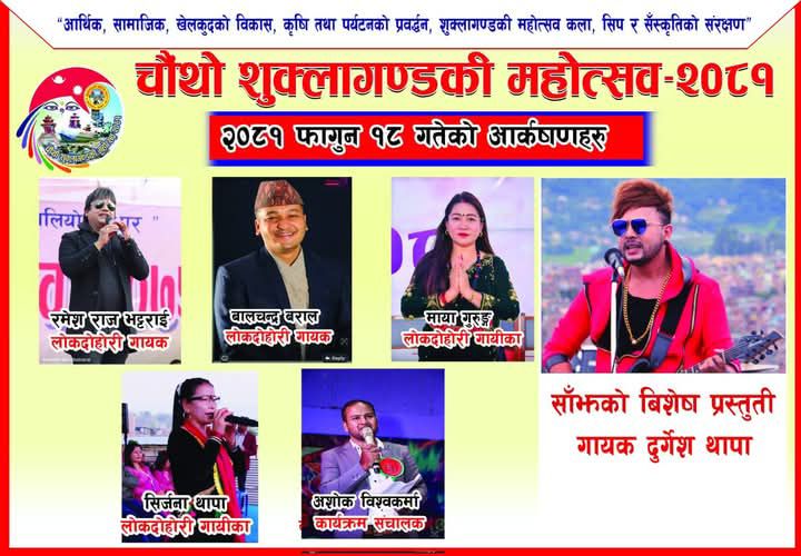 दुलेगौंडा, १८ फागुन । तनहुँको शुक्लागण्डकी–५ बेलचौतारामा जारी चौथो शुक्लागण्डकी महोत्सवमा आज ९आइतवार०गायक दुर्गेश थापा विशेष प्रस्तुति लिएर आउने भएका छन् ।