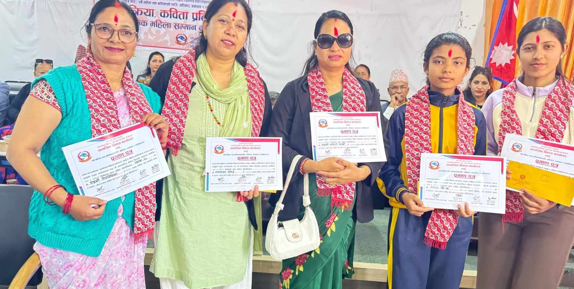 ”महिला र श्रम’ विषयमा आयोजित कविता प्रतियोगितामा व्यास-१० निवासी लक्ष्मी तिमल्सिना पौडेल द्वितीय र शुक्लागण्डकी-३ निवासी आशा पौडेल तृतीय स्थान हासिल गर्न सफल भए ।