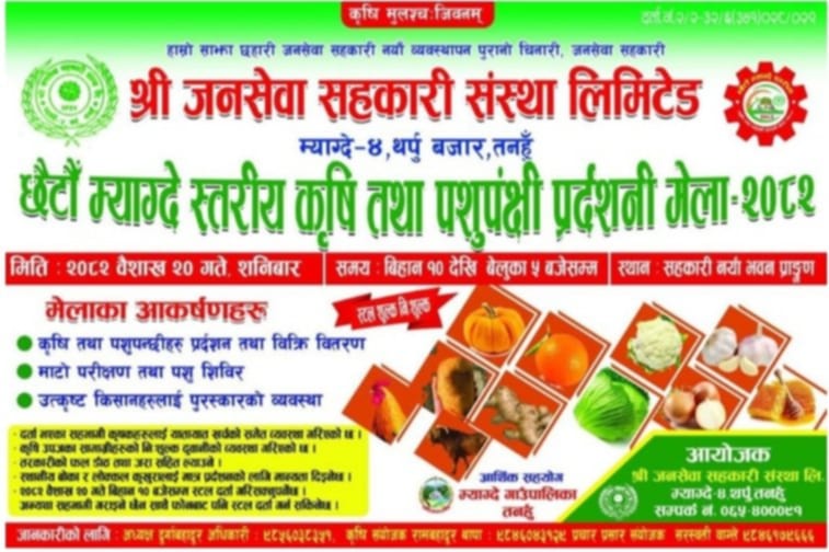 तनहुँ । तनहुँको म्याग्दे गाउँपालिकाको थर्पु बजारमा आगामी बैशाख २० गते छैठो म्याग्दे स्तरिय कृषि तथा पशुपंक्षी प्रर्दशनी मेला २०८२ हुने भएको छ । म्याग्दे गाउँपालिका वडा नं. ४ थर्पु बजारमा रहेको जनसेवा सहकारी संस्था लिमिटेडको आयोजनामा उक्त प्रर्दशनी हुन लागेको हो । म्याग्दे गाउँपालिकाको आर्थिक सहयोगमा हुन लागेको प्रर्दशनीमा निःशुल्क स्टल उपलब्ध गराईने र मेलामा म्याग्दे गाउँपालिकाभरिका किसानहरुले उत्पादन गरेको खाद्यवस्तुहरुदेखि पशुपंक्षीहरुको प्रर्दशनीका साथै खरिबिक्री पनि हुने आयोजकले जनाएको छ । सहकारीकै भवनमा गरिएको उक्त प्रर्दशनीमा माटो परिक्षण, पशु शिविर आयोजना गरिनुका साथै प्रर्दशनीमा राखिने कृषि उपजहरुको लागि निः शुल्क ढुवानीको पनि व्यवस्था गरिएको छ । साथै उक्त प्रर्दशनीमा सहभागी उत्कृष्ट किसानलाई पुरस्कारको व्यवस्था गरिएको पनि आयाृेजकले बताएको छ ।