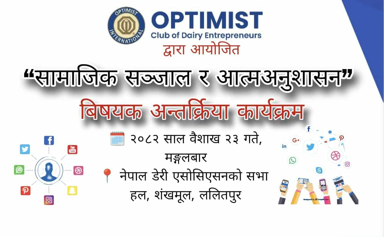 काठमाडौं, वैशाख २० ।सामाजिक सञ्जालको जिम्मेवार र आत्मअनुशासित प्रयोगबारे सचेतना फैलाउने उद्देश्यले अप्टिमिष्टिक क्लब अफ डेरी ईन्टरप्रेनरर्सले विशेष अन्तर्क्रिया कार्यक्रम आयोजना गर्ने भएको छ।