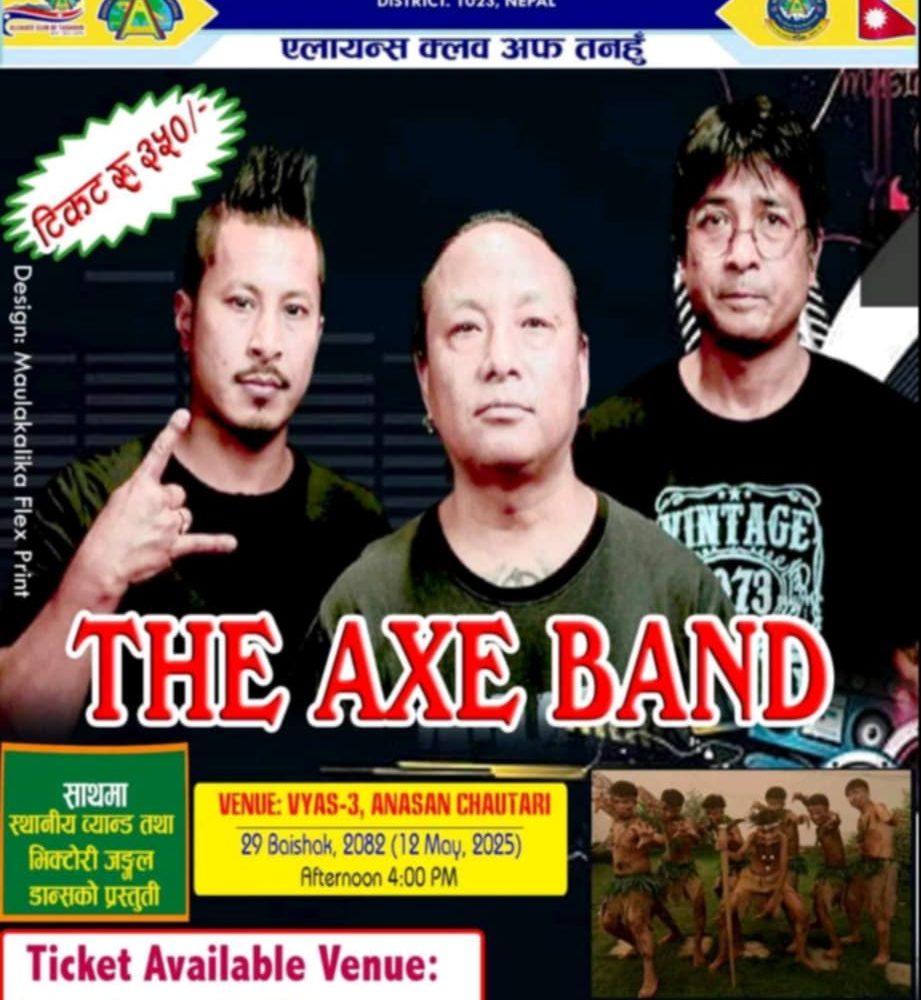 तनहुँ । तनहुँको दमौली बजारमा बैशाष २९ गते लाइभ कन्सर्टको कार्यक्रम हुदैछ । २५६९ औँ बुद्ध जयन्तीको अवसरमा अलायन्स क्लब अफ तनहुँको आयोजनामा The Exe Band..ले दमौलीको अनसन चौतारी नजिकको खुल्ला चौरमा लाईभ कन्सर्ट प्रस्तुत हुन लागेको हो । कन्सर्टमा स्थानिय व्याण्डहरुको पनि प्रस्तुति रहने आयोजक संस्था अलायन्स क्लब अफ तनहुँका अ ध्यक्ष अर्जुन पौडेलले जानकारी दिएका छन् । अपरान्ह ४ बजेदेखि राती १० बजेसम्म हुने कन्सर्ट The Exe Band का फ्यान र मनोरन्जन चाहने व्यक्तिहरुका लागि निकै प्रभावकारी हुने आयोजकले जनाएको छ । साथै थप जानकारीको लागि 984-6275211 9864426463 र 984-6776896 नम्बरमा सम्पर्क गर्न पनि अलायन्स क्लब अफ तनहुँले आग्रह गरेको छ ।