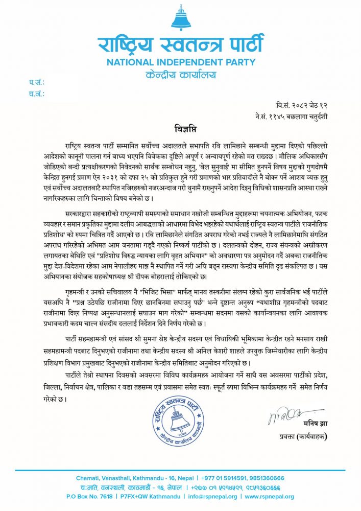 काठमाडौं । राष्ट्रिय स्वतन्त्र पार्टीले सर्वोच्च अदालतले सभापति रवि लामिछाने सम्बन्धी मुद्दामा दिएको पछिल्लो आदेशको कानूनी पालना गर्न बाध्य भएपनि विवेकका दृष्टिले अपूर्ण र अन्यायपूर्ण रहेको निष्कर्ष निकालेको छ ।