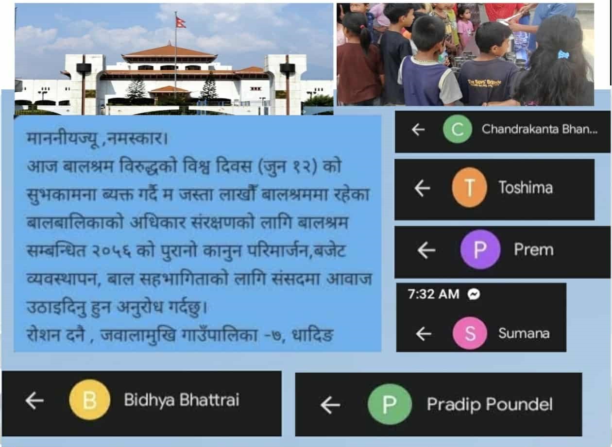 “माननीयज्यू, नमस्कार। आज बालश्रम विरुद्धको विश्व दिवस (१२ जुन) को शुभकामना व्यक्त गर्दै म जस्ता लाखौं बालश्रममा रहेका बालबालिकाको अधिकार संरक्षणको लागि बालश्रम सम्बन्धी २०५६ को पुरानो कानुन परिमार्जन, बजेट व्यवस्थापन, बाल सहभागीताको लागि संसदमा आवाज उठाईदिनु हुन अनुरोध गर्दछु।”