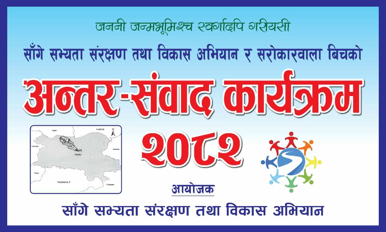 काठमाण्डौ । साँगे सभ्यता संरक्षण तथा विकास अभियानले तनहुँ सदरमुकाम दमौलीमा अन्तरसंवाद कार्यक्रम आयोजना गर्ने भएको छ । अभियान बारे जानकारी गराउने उदेश्यले आगामी असार ३ गते मंगलवार अभियानले अन्तर संवाद कार्यक्रम आयोजना गर्न लागेको हो । “यहि असार ३ गते मंगलवार अभियानले व्यास नगरपालिकाको हलमा अन्तर संवाद कार्यक्रम आयोजना गर्ने तय गरेको छ, व्यास नगरपालिकाका मेयर बैकुण्ठ न्यौपानेको प्रमुख आतिथ्यतामा कार्यक्रम गर्ने भन्ने अनुसार हामीले न्यौपानेलाई आमन्त्रण गरेका छौँ, ४ बजेबाट कार्यक्रम सुरु गर्ने हाम्रो योजना छ, यद्यपि केही औपचारिकता भने अझै बाँकी छ, हामी तयारी साथ बसेका छौँ” कार्यक्रम आयोजना बारे जानकारी दिदै अभियानका संयोजक सुरेन्द्र वाग्लेले बताएका छन् । अभियानले साँगे क्षेत्र अन्तर्गत पर्ने वडाका जनप्रतिनिधिहरुसहित स्थानीय एवम् सरोकारवालाहरु समेतलाई आमन्त्रण गरिने संयोजक वाग्लेले बताएका छन् ।