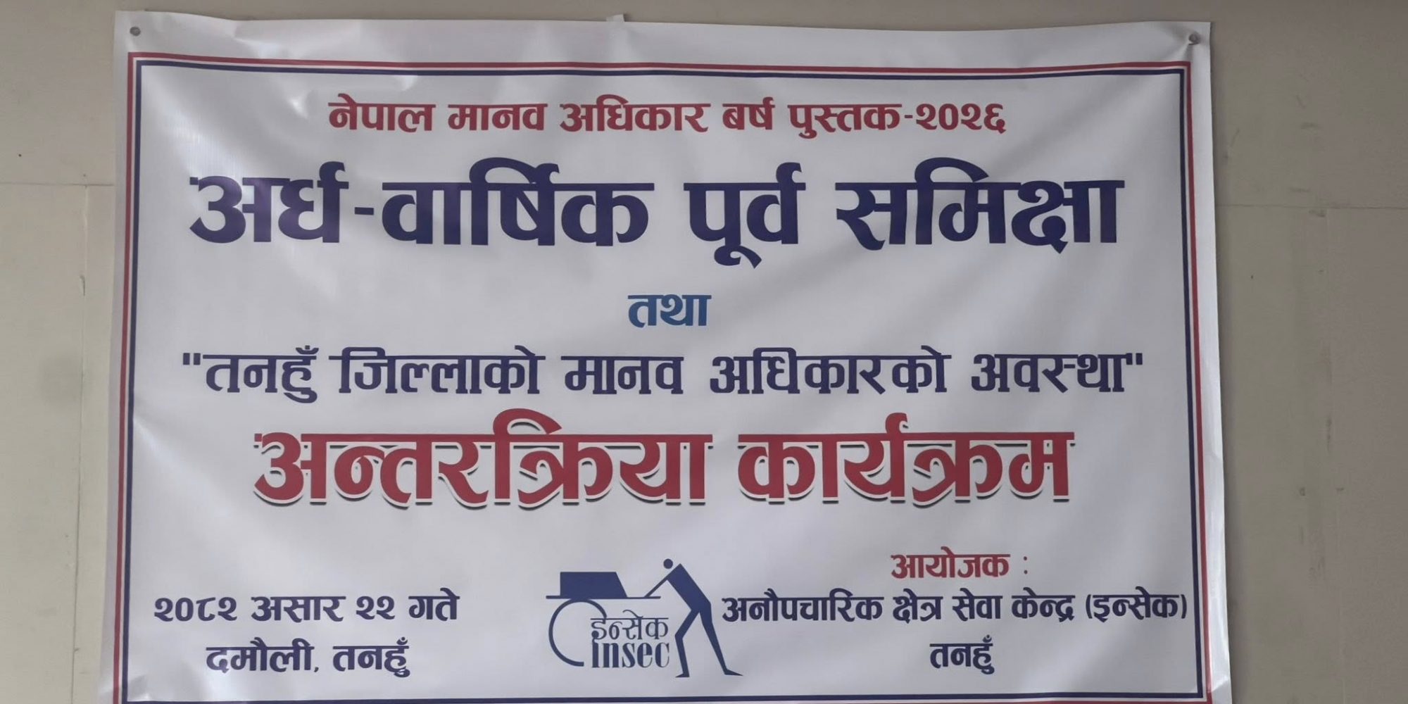 तनहुँ । अनौपचारिक क्षेत्र सेवा केन्द्र (इन्सेक) तनहुँको आयोजनामा नेपाल मानव अधिकार वर्ष पुस्तक–२०२६ को अन्तरक्रिया कार्यक्रम आइतबार दमौलीमा सम्पन्न भयो । मानवअधिकार वर्ष पुस्तकको लागि सङ्कलित घटनाहरुको बारेमा सरोकारवाला निकायको सुझाव सङ्कलन गर्ने उद्देश्यले आयोजना गरिएको थियो ।