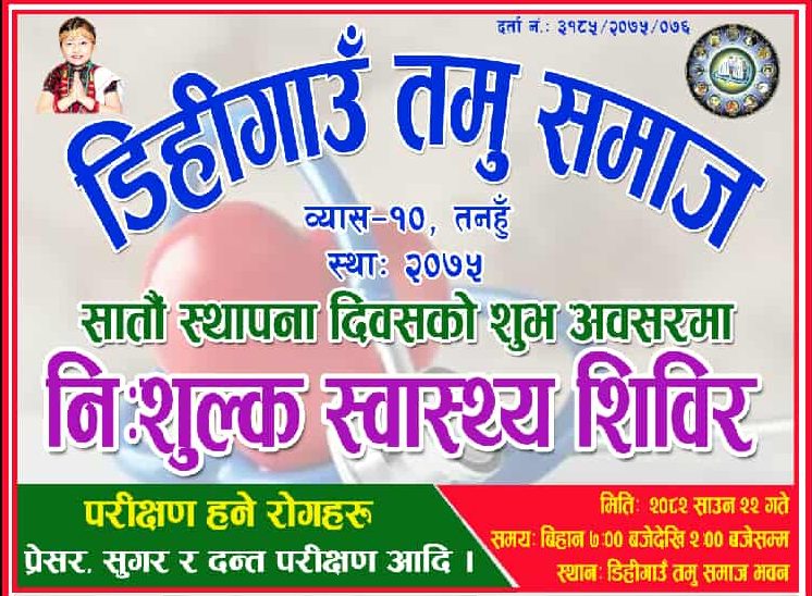 तनहुँ । तनहुँको व्यास नगरपालिका वडा नं. १० डिहीगाउँमा साउन २२ गते बिहिवार निःशुल्क स्वास्थ्य स्वास्थ्य शिविर हुने भएको छ । डिहिगाउँ तमु समाजको आयोजनामा हुन लागेको शिविरमा सुगर, प्रेसर, दन्त् परिक्षण लगायत अन्य रोगहरुको पनि परिक्षण हुने भएको छ । डिहिगाउँ तमु समाजको सातौं स्थापना दिवसको अवसरमा आयोजना गर्न लागगिएको उक्त शिविर डिहिगाउँमा रहेको समाजको भवनमा बिहान ७ बजेदेखि दिनको २ बजेसम्म हुनेछ । उक्त स्वास्थ्य शिविर निःशुल्क आयोजना गरिएको र शिविरमा दक्ष चिकित्सकहरुले स्वास्थ्य परिक्षण गर्ने भएकोले सहभागि हुन डिहिगाउँ तमु समाजले सबैलाई आग्रह गरेको छ ।