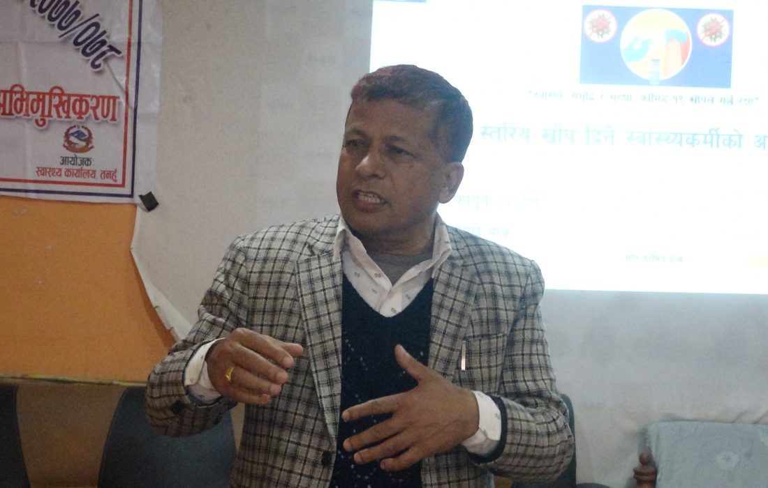 उक्त अभिमुखिकरण कार्यक्रममा जिल्ला स्वास्थ्य कार्यालय तनहूँका खोप अधिकारी बिरेन्द्र कुमार चौधरीले स्वास्थ्यकर्मीलाई लाई प्रशिक्षण दिनु भएको थियो ।