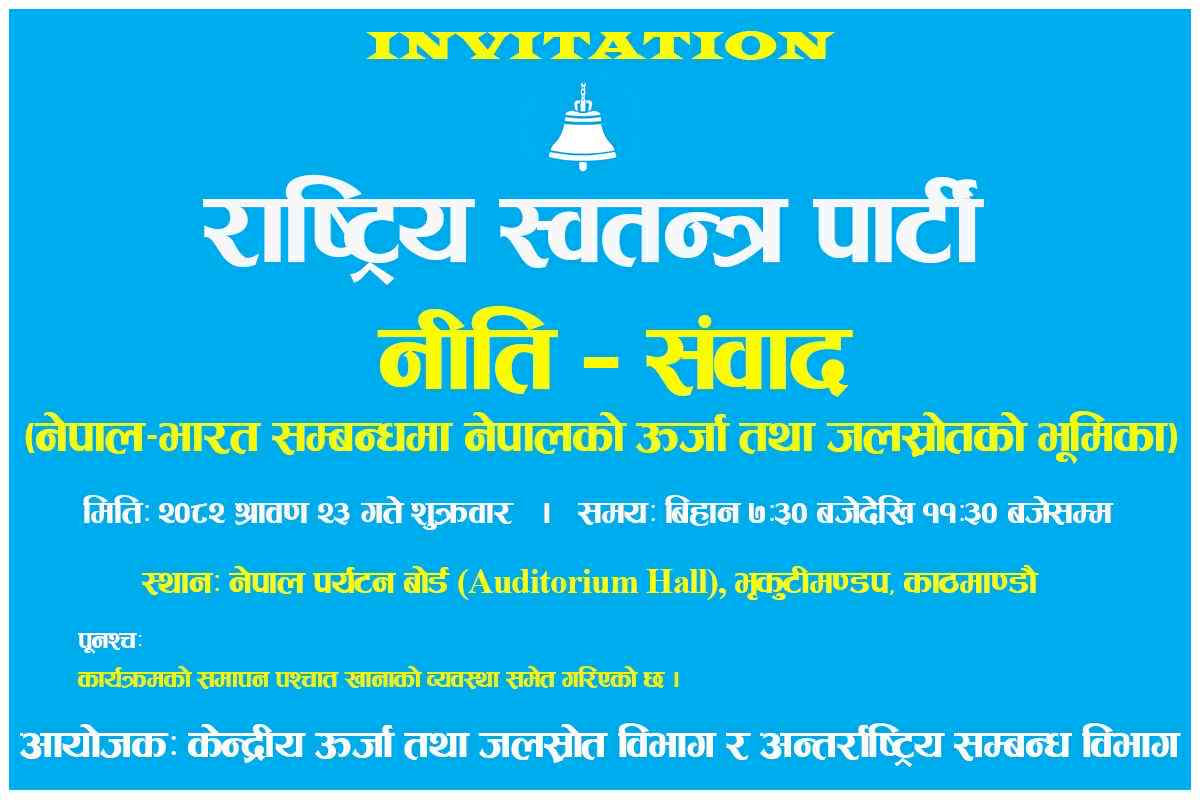 काठमाण्डौ । राष्ट्रिय स्वतन्त्र पार्टी (रास्वपा) ले नेपाल भारत सम्बन्धमा नेपालको उर्जा तथा जलश्रोतको भुमिका बिषयमा नीति सम्वाद कार्यक्रम गर्न गईरहेको छ । रास्वपाको केन्द्रीय उर्जा तथा जलश्रोत विभाग र अन्तर्राष्ट्रिय सम्बन्ध विभागको आयोजनामा साउन २३ गते शुक्रवार उक्त सम्वाद कार्यक्रम आयोजना गर्न लागिएको हो । काठमाण्डौंको भृकुटीमण्डपको नेपाल पर्यटन बोर्डमा बिहान ७ः ३० बजेबाट शुरु हुने कार्यक्रममा नेपाली कांग्रेसका नेता एन् पि साउद, नेकपा एमालेका नेता अग्नि खरेल, नेकपा माओवादी केन्द्रका नेता शक्तिबहादुर बस्नेत, रास्वपाका नेता डा. स्वर्णिम वाग्ले र शिशिर खनाल, पुर्व राजदुतद्धय डा. जयराज आचार्य र बिजय कान्त कर्ण, प्रा. डा. ज्ञानेन्द्रमान शाक्य, ई. अनुपकुमार उपाध्याय लगायतका विज्ञहरुको सहभागिता रहने रास्वपाको केन्द्रीय उर्जा तथा जलश्रोत विभागका प्रमुख ईन्जिनियर श्रीराम न्यौपानेले बताएका छन् । विज्ञ तथा विभिन्न पार्टीका नेताहरुका साथ गरिने सम्वाद कार्यक्रमबाट नेपाल भारत सम्बन्धमा नेपालको उर्जा तथा जलश्रोतको भुमिकाका बारेमा गहन विचार बिमर्श गर्ने अवसर प्राप्त भएको र यस्ले रास्वपाले आफ्ना उर्जा तथा जलश्रोतका बारेमा कार्यक्रमहरु बनाउन सघाउ पुग्ने ई न्यौपानेले बताएका छन् ।