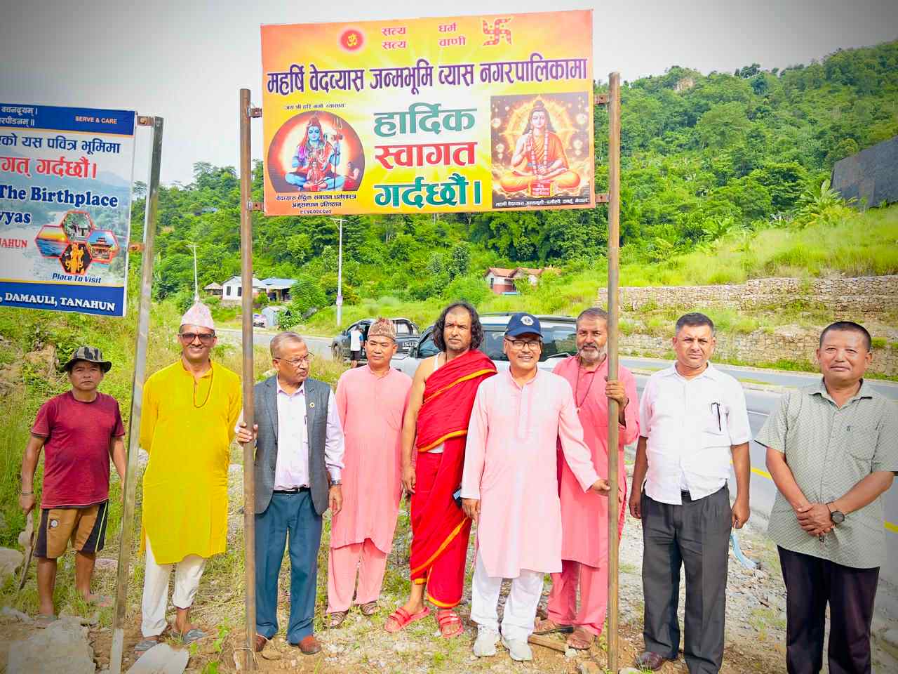 तनहुँ । महर्षि बेदव्यासको पवित्र जन्मभुमी व्यास नगरपालिकामा प्रवेश गर्ने व्यक्तिहरुलाई स्वागत तथा यस पवित्र भुमिबाट विदाई हुनेका लागि धन्यवाद ज्ञापन गरिएको बोर्ड व्यास नगरपालिकाका दुवै सिमानामा राखिएको छ । वेदव्यास बैदिक धर्मशास्त्र अनुसन्धान प्रतिष्ठानले उक्त स्वागत तथा विदाई बोर्ड आज गण्डकी प्रदेशका सांसद माननिय अशोककुमार श्रेष्ठ र व्यास नगरपालिकाका मेयर बैकुण्ठ न्यौपाने सम्युक्त रुपमा स्थापना गरेका छन् । व्यासको जन्मुभुमी चिनाउनका लागि सबै लाग्नुपर्नेमा दमौलीकै वेदव्यास बैदिक धर्मशास्त्र अनुसन्धान प्रतिष्ठानले बोर्ड निर्माण गरि व्यास नगरपालिकाको सिमानामा राखेकोमा आफुहरु हर्षित भएको सांसद श्रेष्ठ र मेयर न्यौपानेले बताएका थिए । उत्तः अवसरमा वेदव्यास बैदिक धर्मशास्त्र अनुसन्धान प्रतिष्ठानका संरक्षक ध्यानाचार्य जयश्रीहरि खेमराजले वेदव्यासलाई अझै देश विदेशमा चिनाउनका लागि आफु सदा लागिरहने बताएका थिए । उक्त बोर्ड व्यास नगरपालिकाको सिमाना पुर्व तर्फ व्यास १२ र बन् दीपुर गाउँपालिका वडा नं. १ को सिमाना र पशिचमतर्फ व्यास ५ म्याग्दे गाउँपालिका वडा नं. १ को सिमानामा राखिएको छ ।