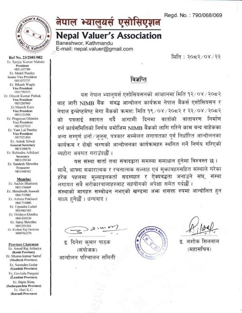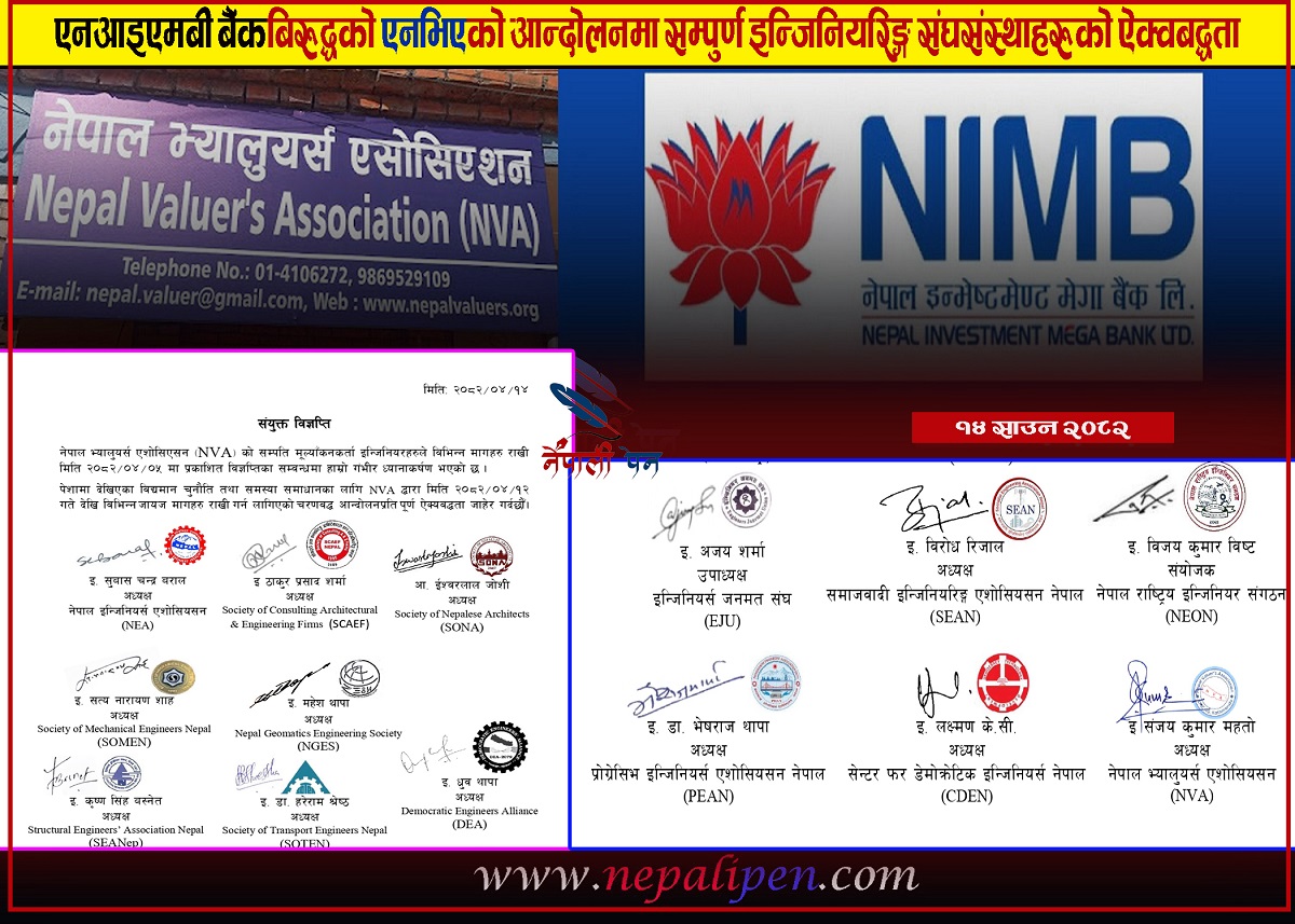 काठमाडौं,२३ साउन । चल अचल सम्पत्ति मुल्यांकनकर्ताहरुको छाता संगठन नेपाल भ्यालुयर्स एशोसिएसन (एनभिए) ले नेपाल इन्भेष्टमेन्ट मेगा (एनआइएमबी) बैंक बिरुद्ध आन्दोलनका कार्यक्रम अझै जारी राख्ने भएको छ ।