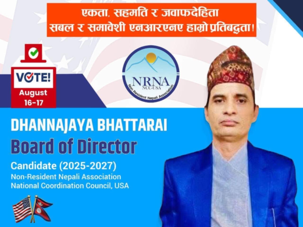 काठमाण्डौ । अमेरिकामा हुन लागेको NRNA NCC को वोर्ड अफ डाइरेक्टर (BOD) पदमा धनन्जय भट्टराईले आफ्नो उमेदवार दिएका छन् । पाँचथरको रानीटारमा जन्मिएका भट्टराई काठमाडौंलाई कर्मथलो बनाए पनि हाल अमेरिकाको ओहायो बस्दै आउनु भएको छ । ओहायोमा व्यावसाय समेत गर्दै बस्दै आउनु भएका भट्टराई सामाजिक तथा धार्मिक कार्यमा परिचित रहनु भएको छ । विभिन्न सामाजिक संघ संस्थामा आवद्ध तथा नेतृत्वदायी भुमिका निर्वाह गरिसकेका भट्टराई जागरण एकेडेमि एण्ड रिट्रिट सेन्टरको मोटिभेसनल स्पिकर र ट्रेनरको रुपमा समेत कार्य गर्दै आउनु भएको छ । एनआरएनए मा भएको विवादलाई सन्तुलित समायोजन तरहबाट समाधान गर्नु पर्नेमा उहाँको जोड रहेको छ । यस अघि पनि उहाँले एनआरएनए ओहायोको बोर्ड अफ डारेक्टरमा काम गरि सक्नु भएको छ । उहाँले यो पालीको अगस्ट १६-१७ मा हुने निर्वाचनमा सम्पूर्ण एनआरएनए अभियन्ताहरुलाई अमेरिकाको NRNA NCC को वोर्ड अफ डाइरेक्टर (BOD) पदमा भोट दिएर निर्वाचित गराउन आब्हान समेत गर्नु भएको छ ।
