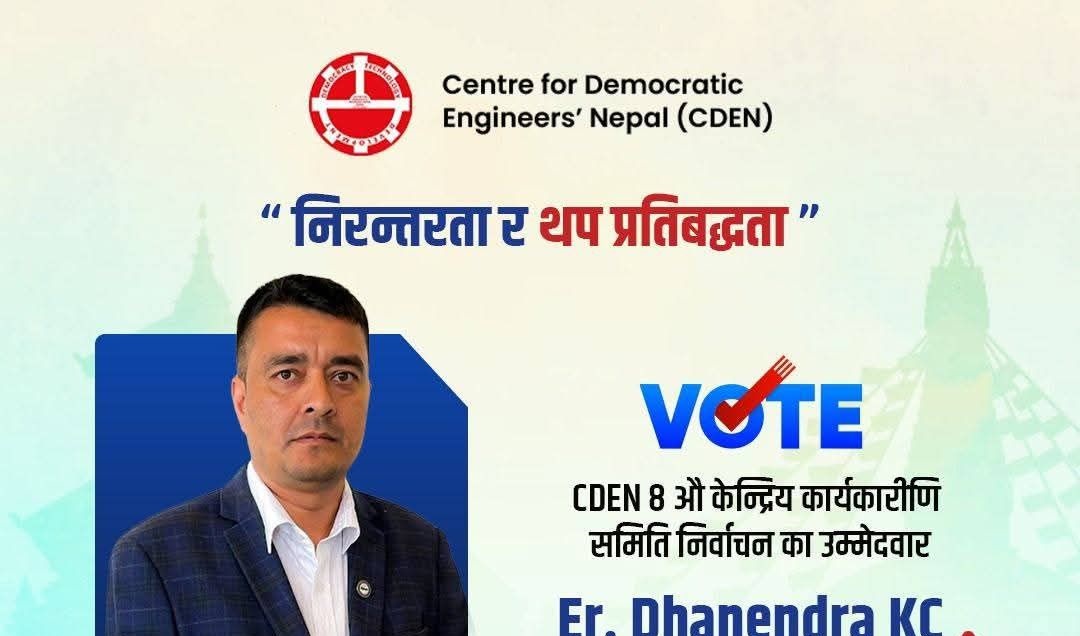 काठमाडौं । नेपाली काँग्रेसको शुभेच्छुक संस्था सेन्टर फर डेमोक्रेटिक इन्जिनियर्स नेपाल (सिडेन) को आठौं केन्द्रीय कार्यकारिणी समितिको निर्वाचनमा अध्यक्ष पदमा इ. धनेन्द्र केसीले आफ्नो ७ बुँदे प्रतिवद्धतापत्र सार्वजनिक गरेका छन् ।