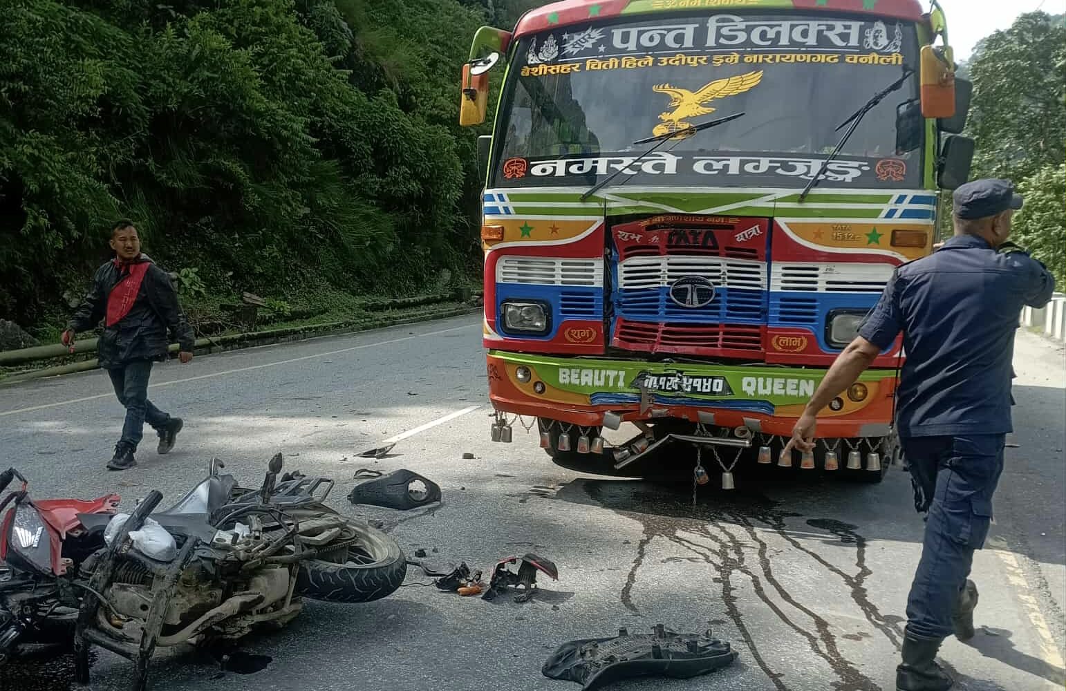 भदौ १६ – नारायणगढबाट लमजुङ चितितर्फ गइरहेको ग १ ख ४१४० नम्बरको बस र विपरीत दिशाबाट आउँदै गरेको ग १२ प६९९२ नम्बरको मोटरसाइकल ठोक्किदा मोटरसाइकल चालक तनहुँको भिमाद नगरपालिका वडा नं. –२ का किसान बि. क.को मृत्यु भएको छ। चितवनको भरतपुर महानगरपालिका–२९ स्थित १७ किलोमा भएको दुर्घटनामा घाईते बि. क. को मृत्यु भएको हो ।