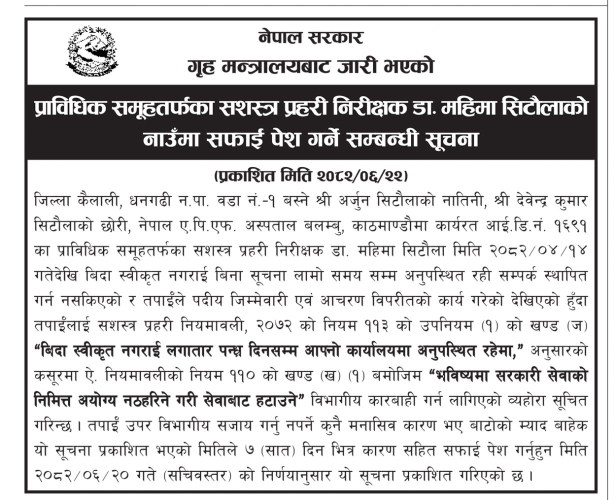 काठमाडौं । सशस्त्र प्रहरीकी इन्सपेक्टर डा. महिमा सिटौलालाई सेवाबाट हटाउने तयारी गरिएको छ ।
