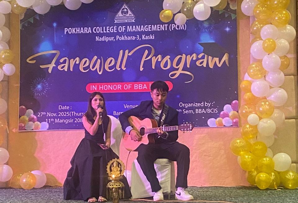 पोखरा, ११ मंसिर । पोखरा कलेज अफ म्यानेजमेन्ट(पिसिएम)ले स्नातक तहको अध्ययन पूरा गरेका विद्यार्थीहरुलाई एक कार्यक्रमका वीच विदाइ गरेको छ । कलेजले विहिबार कार्यक्रम आयोजना गरि विद्यार्थीहरुलाई मायाको चिनोसहित विदाइ गरेको हो ।