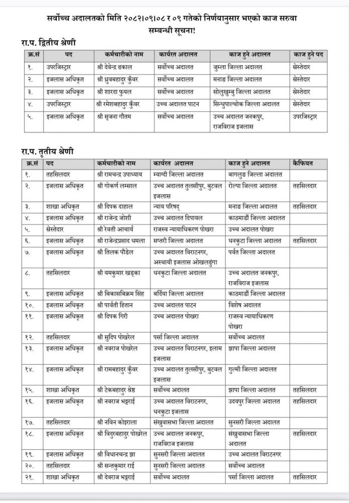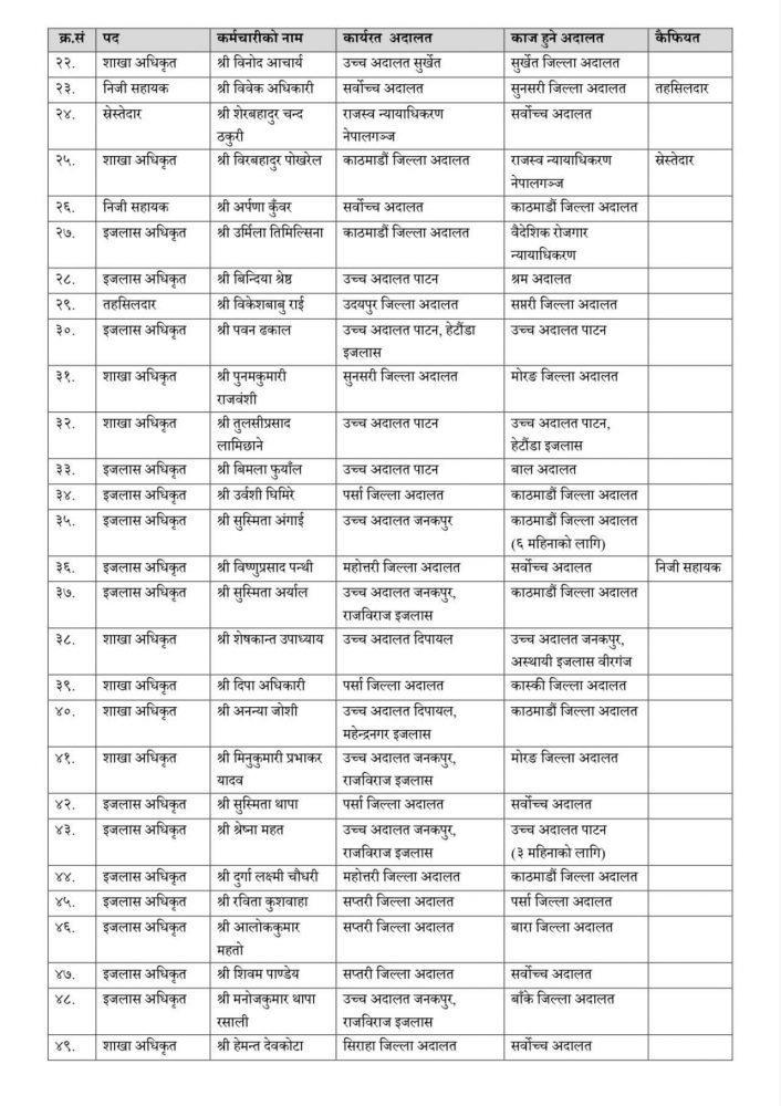 काठमाडौँ । सर्वोच्च अदालतले ५ उपसचिव र ४९ शाखा अधिकृतको काज सरुवा गरेको छ ।