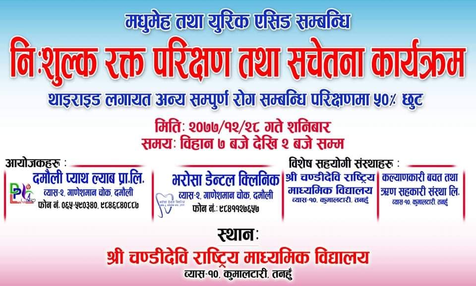 तनहूँ । व्यास नगरपालिका वडा नं. १० को चण्डिदेबि राष्ट्रिय मा. बि. मा मधुमेह तथा युरिक सम्बन्धि निशुल्क रक्त परिक्षण तथा जनचेतना कार्यक्रम गरियो । व्यास २ गणेशमानचोकमा रहेको दमौली प्याथ ल्याब प्रा.लि. र भरोसा डेन्टल क्लिनिकको आयोजनामा उक्त कार्यक्रमको आयोजना भएको थियो । उक्त अवसरमा २०० जना व्यक्तिहरुको निशुल्क रक्त परिक्षण गरिएको थियो ।