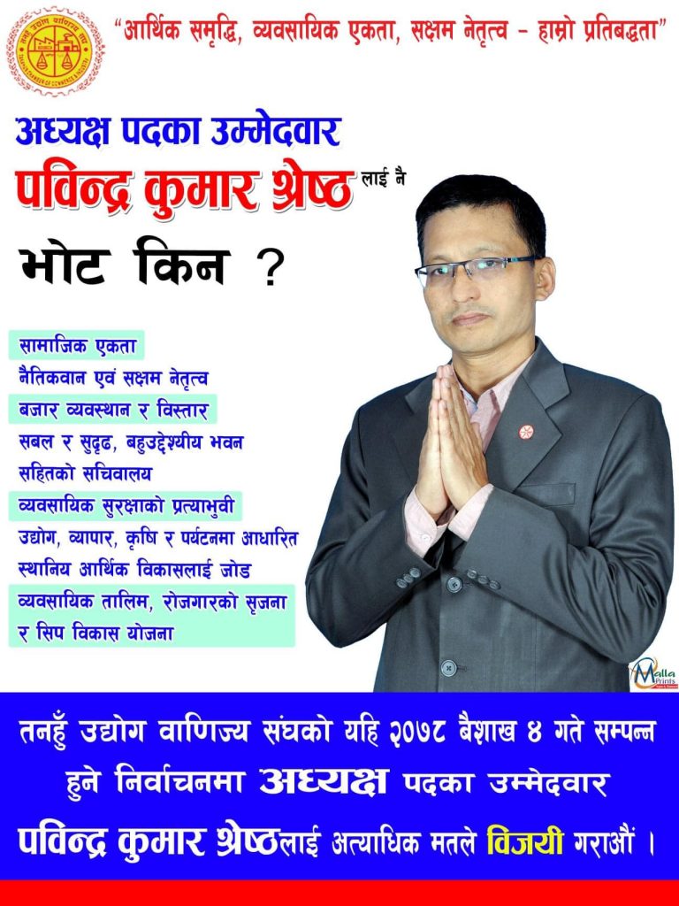 बैकुण्ठनाथ मिश्र, पविन्द्र कुमार श्रेष्ठ र अर्जुन अधिकारी (सागर उदास)को दावेदारीले तनहूँ उद्योग बाणिज्य संघको निर्वाचन झनै रोचक हुने अनुमान गरिएको छ ।