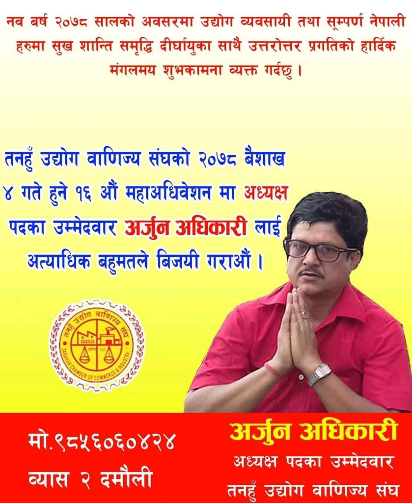 तनहूँ उद्योग वाणिज्य संघको नेतृत्वको दावी गर्ने प्रथम उपाध्यक्ष बैकुण्ठनाथ मिश्र र पूर्व महासचिव पविन्द्रकुमार श्रेष्ठ नेपाली कांग्रेस निकट हुनुहुन्छ भने अर्का प्रत्यासी अर्जुन अधिकारी (सागर उदास) नेकपा (एमाले) निकट मानिनुहुन्छ ।