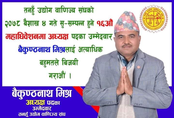 अध्यक्ष पदको मुख्य दावेदार मानिनुभएका बैकुण्ठ नाथ मिश्रले पत्रकार सम्मेलन गरि आफु अगाडि बढिसकेको र तर्कसंगत कुरा आए सर्वसम्मत निर्णय मान्न तयार रहेको पनि बताउनुभएको थियो । उक्त अवसरमा वहाँले आफु बजार ईकाईको सदस्यबाट प्रथम उपाध्यक्षसम्म भएको र अघिल्लो पटक पनि मानकाजी श्रेष्ठको लागि अध्यक्ष पद त्याग गरेको हुनाले पनि स्वत दावेदार रहेको पनि बताउनुभएको थियो । उक्त पत्रकार सम्मेलनमा नवनिर्वाचित तनहूँ उद्योग वाणिज्य संघ दमौली वजार ईकाईका सभापति भुपाल आले, तनहूँ उद्योग वाणिज्य संघको आगामी निर्वाचनमा प्रथम उपाध्यक्षका उमेदवार सुरेश पुरी लगायतका महानुभावहरुको उपस्थिति रहेको थियो । उक्त अवसरमा वहाँहरुले बैकुण्ठ मिश्र योग्य र सक्षम भएको हुनाले विजयी हुने बताउनुभएको थियो । कार्यक्रममा अध्यक्ष पदका प्रत्यासी मिश्रले पत्रकारहरुको प्रश्नको उत्तर दिदै आफ्ना आगामी योजनाहरु पनि सुनाउनुभएको थियो ।