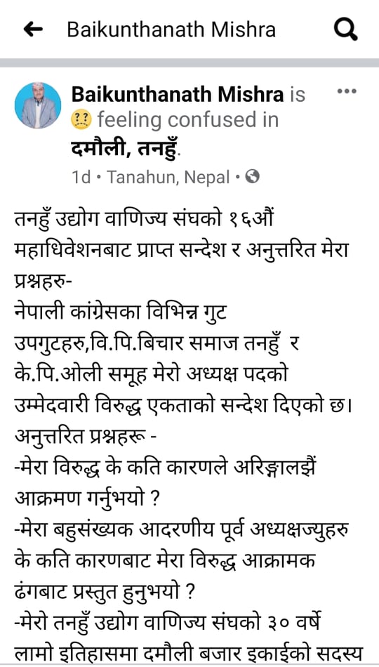 तनहूँ उद्योग बाणिज्य संघको निर्वाचनमा लोकतान्त्रिक विचारधाराका उमेदवार मिश्रलाई आफ्नै पार्टी नेपाली कांग्रेसले साथ नदिएको र पार्टी स्वतन्त्र भुमिका नबसेको भन्दै विभिन्न कोणबाट टिकाटिप्पणी भईरहेको बेला व्यास नगर विकास समितिको रिक्त सदस्य पदमा वहाँको मनोनयनलाई चहराईरहेको बैकुण्ठनाथ मिश्रको घाँउमा मलम लगाउने प्रयासको रुपमा लिएका छन् भने कतिपयले बैकुण्ठनाथ मिश्रले फेसबुक पेजमा खोजेको अनुत्तरित प्रश्नको उत्तर भनेका छन् । यस बारेमा मिश्रसग प्रतिक्रिया लिन सम्पर्क गर्दा वहाँसग सम्पर्क हुन सकेन ।