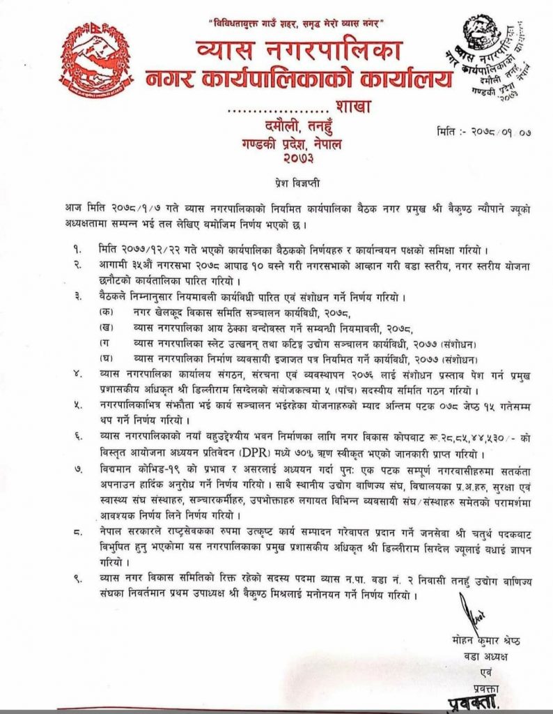 तनहूँ । हालसालै सम्पन्न तनहूँ उद्योग बाणिज्य संघको निर्वाचनमा अध्यक्ष पदमा पराजित हुनुभएका बैकुण्ठ नाथ मिश्रलाई व्यास नगर विकास समितिको रिक्त रहेको सदस्य पद मनोनित गरिएको छ । उक्त कुराको जानकारी व्यास नगरपालिकाका प्रवक्ता मोहनकुमार श्रेष्ठद्वारा जारी विज्ञप्तिमा उल्लेख गरिएको छ ।