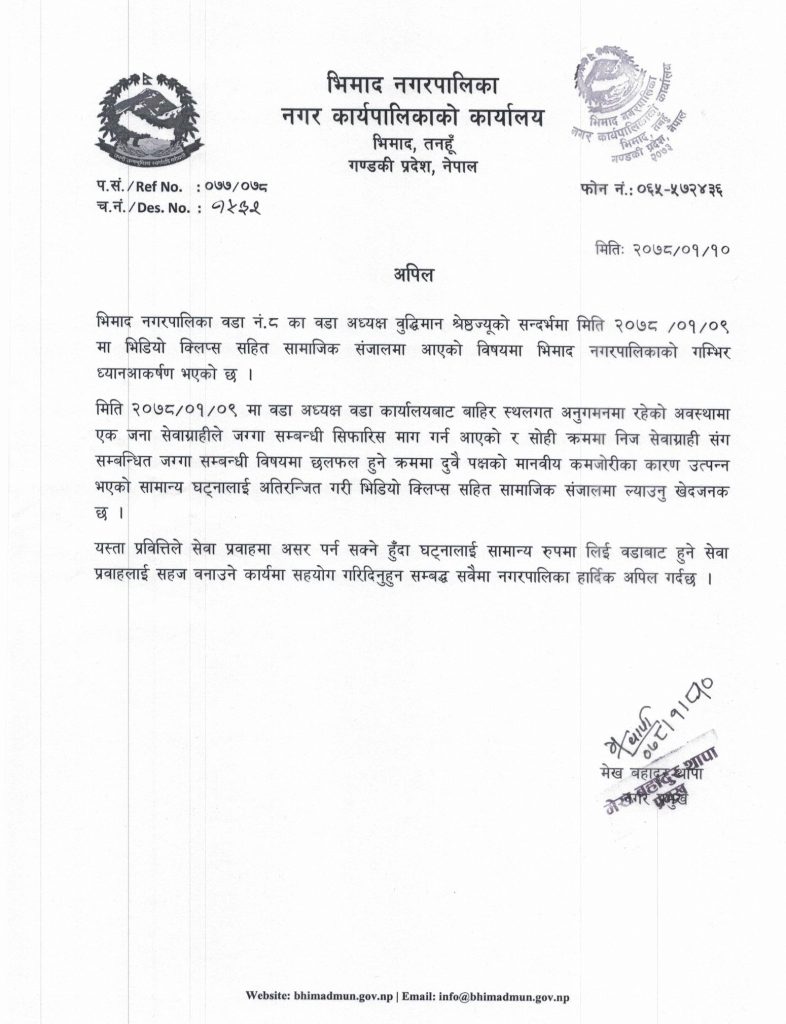 ”यस्ता प्रवृतिले सेवा प्रवाहमा असर पर्न सक्ने भएकाले सामान्य घटनाको रुमा लिएर वडाबाट प्रवाह हुने सेवालाई सहज बनाउन ” नगरपालिकाले अनुरोध गरेको छ ।