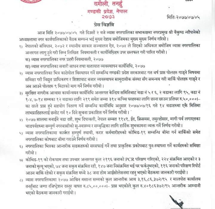 कार्तिक ५ बुधवार । व्यास नगरपालिकाको बोर्ड बैठक बुधबार सम्पन्न भएको छ । उक्त बैठकले विभिन्न ८ वटा निर्णयहरु गरेको छ । ति निर्णयहरुमा व्यास नगरपालिका नगरप्रहरी नियमावली २०७७, व्यास नगरपालिका सवारी साधन तथा यातायात व्यवस्थापन कार्यविधी २०७७, व्यास नगरपालिकाभित्र काठेपोल विस्थापन गर्ने सम्बन्धि गण्डकी प्रदेश सरकारबाट गत बर्ष प्राप्त पोलहरु गाड्न विद्युत प्राधिकरण र शिशाघाट बजार व्यवस्थापन सामुदायिक संस्थासंग समन्वय गरी पोल गाड्ने र अब पोल माग गर्दा ९ मिटरको माग गर्ने , सुरक्षित नागरिक आवास कार्यान्वयन कार्यविधी अन्र्तगत केन्द्रीय समितिबाट विभिन्न वडाहरुमा लाभग्राहीलाई छनौट गर्न १० दिने सूचना प्रकाशित गर्ने ,बैठक दशै तिहार लगायतका चाडपर्वका अवसरमा शुभकामना प्रदान, कोरोना विमा गर्न बाँकि रहेका कर्मचारीको कोरोना बिमा गर्ने , नगरपालिकाभित्रका आन्तरिक सडक सफा गर्ने तथा प्राकृतिक प्रकोपबाट पुनःस्थापना गर्ने कार्यहरुको समिक्षा गर्ने, त्यसैगरि बोर्ड बैठकमा कोरोना महामारीपछि नगरक्षेत्रको अवस्थाको बारेमा समिक्षा गरिएको छ । उक्त बैठकमा गत आर्थिक बर्षको आन्तरिक आय र मालपोत कार्यालय तनहुँबाट जग्गा रजिष्ट्रेशन वापतको रकमको जानकारी दिइएको थियो । विज्ञप्ती अनुसार आन्तरिक आय ३ करोड १६ लाख ८६ हजार ३ सय ७२ रुपैयाँ र रजिष्ट्रेशन दस्तुर ८५ लाख प्राप्त भएकोले कुल आम्दानी ४०१८६३७२र ९५ कुल आम्दानी भएको व्यास नगरपालिकाका प्रवक्ता मोहनकुमार श्रेष्ठद्धारा जारी विज्ञप्तीमा जनाईएको छ । बडा दशैको शुरुवातको समयमा बसेको व्यास नगरपालिकाको बोर्ड बैठक नगरप्रमुख बैकुण्ठ न्यौपानेको अध्यक्षतामा बसेको थियो ।