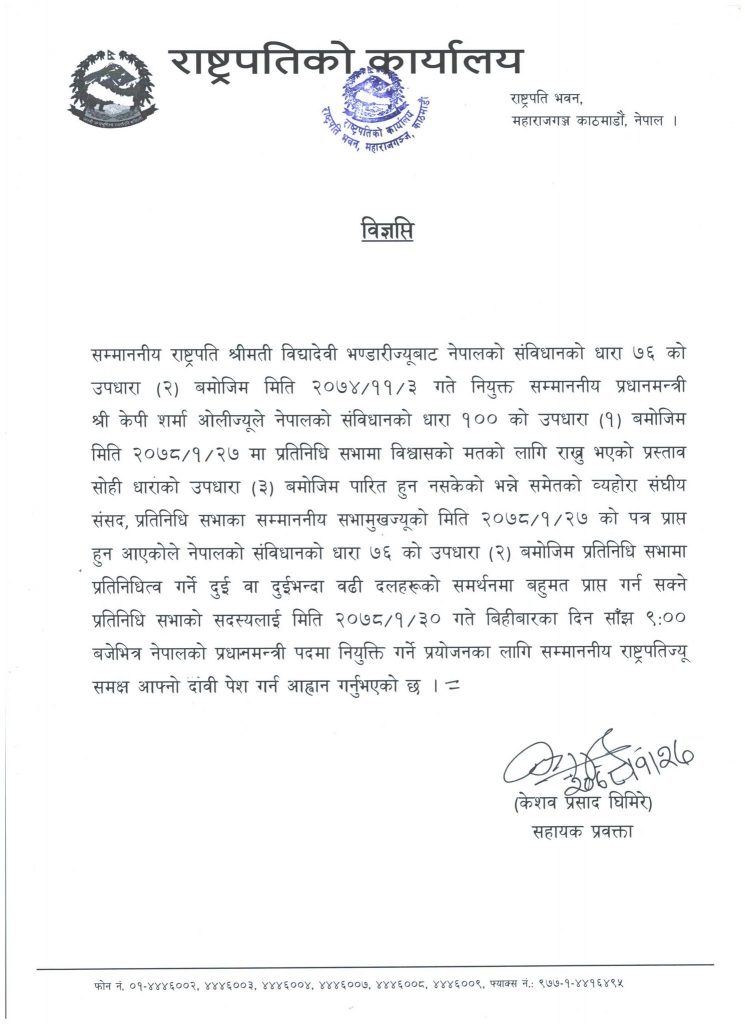 प्रधानमन्त्री केपी शर्मा ओलीले नेपालको संविधानको धारा १०० को उपधारा (१) बमोजिम प्रतिनिधिसभामा विश्वासको मतको लागि राखेको प्रस्ताव सोही धाराको उपधारा (३) बमोजिम पारित हुन नसकेको भन्ने समेतको व्यहोरा संघीय संसद, प्रतिनिधिसभाका सभामुखको पत्र प्राप्त हुन आएकोले नेपालको संविधानको धारा ७६ को उपधारा (२) बमोजिम प्रतिनिधि सभामा प्रतिनिधित्व गर्ने दुई वा दुईभन्दा बढी दलहरूको समर्थनमा बहुमत प्राप्त गर्न सक्ने प्रतिनिधिसभाको सदस्यलाई वैशाख ३० गते बिहीबारका दिन साँझ ९ बजेभित्र नेपालको प्रधानमन्त्री पदमा नियुक्त गर्ने प्रयोजनका लागि राष्ट्रपतिसमक्ष आफ्नो दाबी पेश गर्न आह्वान गरिएको राष्ट्रपति कार्यालयले जनाएको छ ।