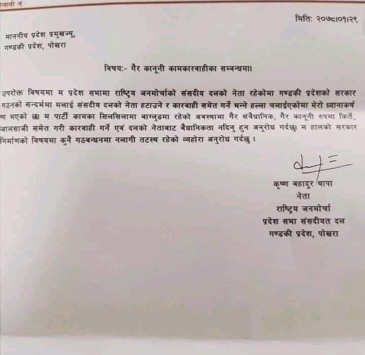 केहि समय अगाडि संसदिय दलको नेताबाट हटाईएका थापाले ” आफु पार्टीको कामको सिलसिलामा वाग्लुगंमा भएकोमा गैर संवैधानिक , गैर कानुनी रुपमा किर्ते जालसाजी गरि कारवाही गर्ने एवं दलको नेताबाट वैधानिकता नदिनुहुन अनुरोध गर्दछु ” भन्नुभएको छ साथै अन्तमा थापाले ” म हाल सरकार निर्माणको विषयमा कुनै गठवन्धनमा नलागि तटस्थ रहेको व्यहोरा अनुरोध गर्दछु” भन्नुभएको छ ।