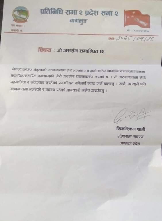त्यसैगरि अर्का सांसद खिम बिक्रम शाहीले पनि विज्ञप्ति निकाल्दै ” नेपाली कांग्रेसको गठबन्धनको सरकार निर्माणमा आफ्नो हस्ताक्षर छ भनि झुटो हल्ला फैलाएको र म हाल सरकार निर्माणको विषयमा कुनै गठवन्धनमा नलागि तटस्थ रहेको व्यहोरा अनुरोध गर्दछु’‘ भन्नुभएको छ ।