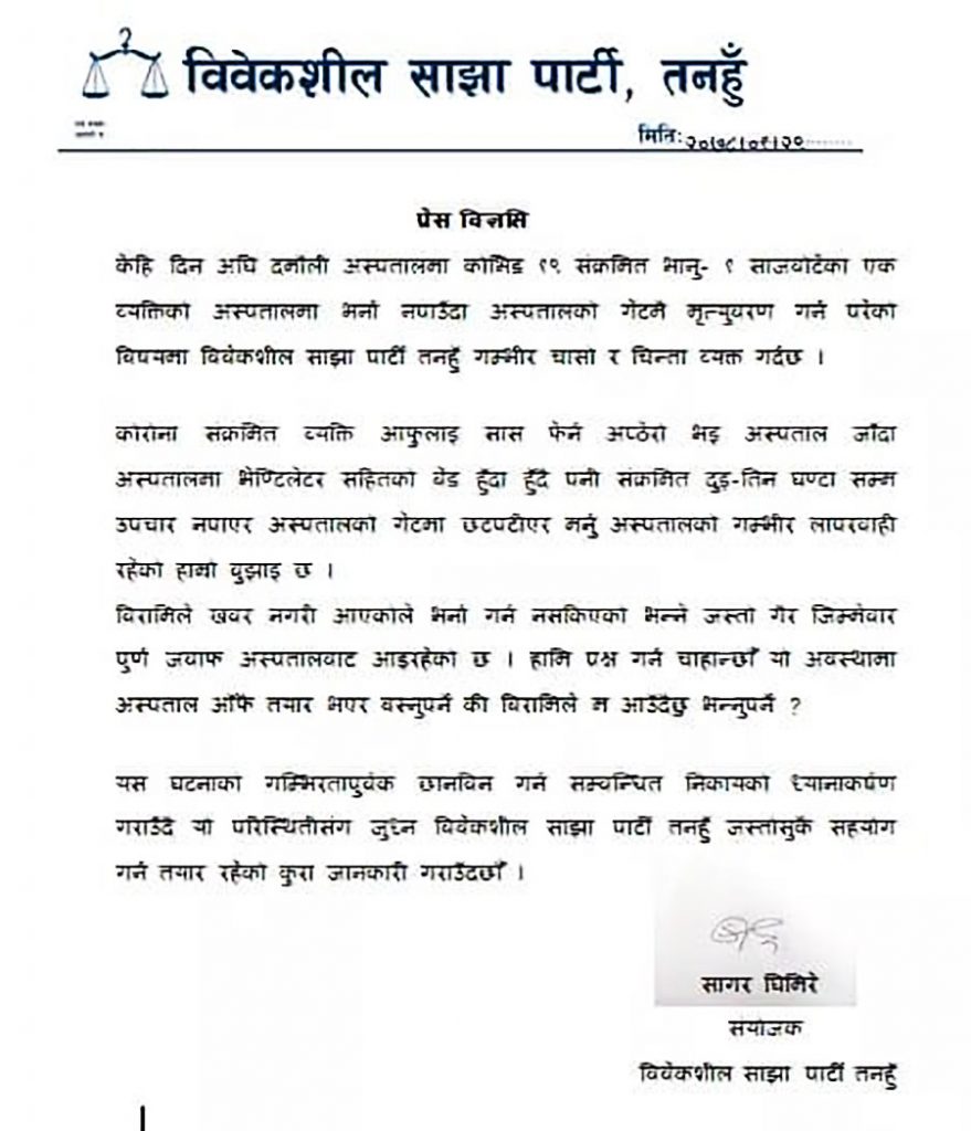 कोरोना संक्रमित व्यक्ति श्वास फेर्न अफ्ठेरो भई अस्पताल जाँदा अस्पतालमा भेन्टिलेटरसहितको बेड हुँदा हुँदै दुई तीन घण्टासम्म उपचार नपाएर छटपटिएर मर्नु अस्पतालको लापरवाही भएको विज्ञप्तिमा जनाइएको छ ।