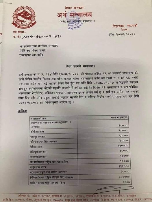 त्यसैगरि अर्थ मन्त्रालयले दमौली अस्पतालमा अक्सिजन प्लान्ट निर्माणको लागि अस्पतालको माग बमोजिम ३० लाख रुपैयाँ उपलब्ध गराउने निर्णय समेत गरेको अर्थ मन्त्रालयबाट जनाईएको छ । यी दुई अस्पतालमा उत्तः बजेट काम भएपछि कोरोना संक्रमित र अन्य रोगका बिरामीको लागि पनि सहज हुने , अस्पतालको स्तरोन्नतिमा पनि पहल पुग्ने सांसद कृष्णकुमार श्रेष्ठ किसानको भनाई रहेको छ ।