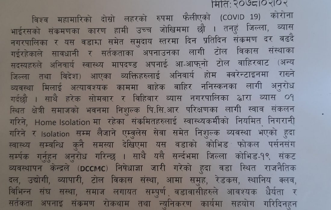 मितिः२०७८।०२।०२ विश्व महामारिको दोस्रो लहरको रुपमा फैलीएको Covid 19 (कोरोना भाईरस) को संकमणका कारण हामी उच्च जोखिममा छौ । तनहूँ जिल्ला, व्यास नगरपालिका र यस वडामा समेत समुदाय स्तरमा दिन प्रतिदिन संक्रमण दर वढदै गईरहेकाले सावधानी र सर्तकताका अपनाउनका लागी टोल विकास संस्थाका सदस्यहरुले अनिवार्य स्वास्थ्य मापदण्ड अपनाई, आ – आफनो टोल वाहिरवाट (अन्य जिल्ला तथा विदेश) आएका ब्यक्तिहरुलाई अनिवार्य होम क्वरेन्टाइनमा राख्ने व्यवस्था मिलाई अत्यावश्यक काममा वाहेक वाहिर ननिस्कनका लागी अनुरोध गर्दछौ । साथै हरेक सोमवार र विहिवार ब्यास नगरपालिका द्वारा ब्यास ०१ स्थित क्षेत्री समाजको भवनमा नि: शुल्क पि. सि. आर परिक्षणका लागी स्वाव संकलन गरिने, Home Isolation मा रहेका संकमितहरुलाई स्वास्थ्यकर्मीको नियमित निगरानी गरिने र Isolation सम्म लैजाने एम्बुलेन्स सेवा समेत निशुल्क ब्यवस्था भएको हुदा स्वास्थ्य सम्वन्धि कुनै समस्या देखिएमा यस वडाको कोभिड फोकल पर्सनसंग सम्पर्क गर्नहुन अनुरोध गरिन्छ । साथै यसै सन्दर्भमा जिल्ला कोभिड १९ संकट व्यवस्थापन केन्द्रले (DCCMC) निषेधाज्ञा जारी गरेको हुदा वडा स्थित राजनैतिक दल, उद्योगी, व्यापारी, टोल विकास संस्था, आमा समह, रेडकस, स्थानिय क्लव, विभिन्न संघ सस्था, समाज लगायत सम्पुर्ण वडावासीहरुले आवश्यक धैर्यता र सर्तकता अपनाइ संक्रमण रोकथाम तथा न्युनिकरण कार्यमा सहयोग गरिदिनहन हार्दिक अनुरोध गर्दै वडावासीको सु – स्वास्थ्यको कामना गर्दछौ ।