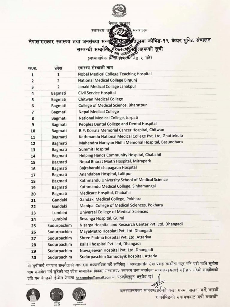 काठमाडौँ — स्वास्थ्य तथा जनसंख्या मन्त्रालयले कोरोनाको उपचारका लागि थप ३० वटा निजी तथा सामुदायिक अस्पताल तथा मेडिकल कलेजहरुको सूची सार्वजनिक गरेको छ ।