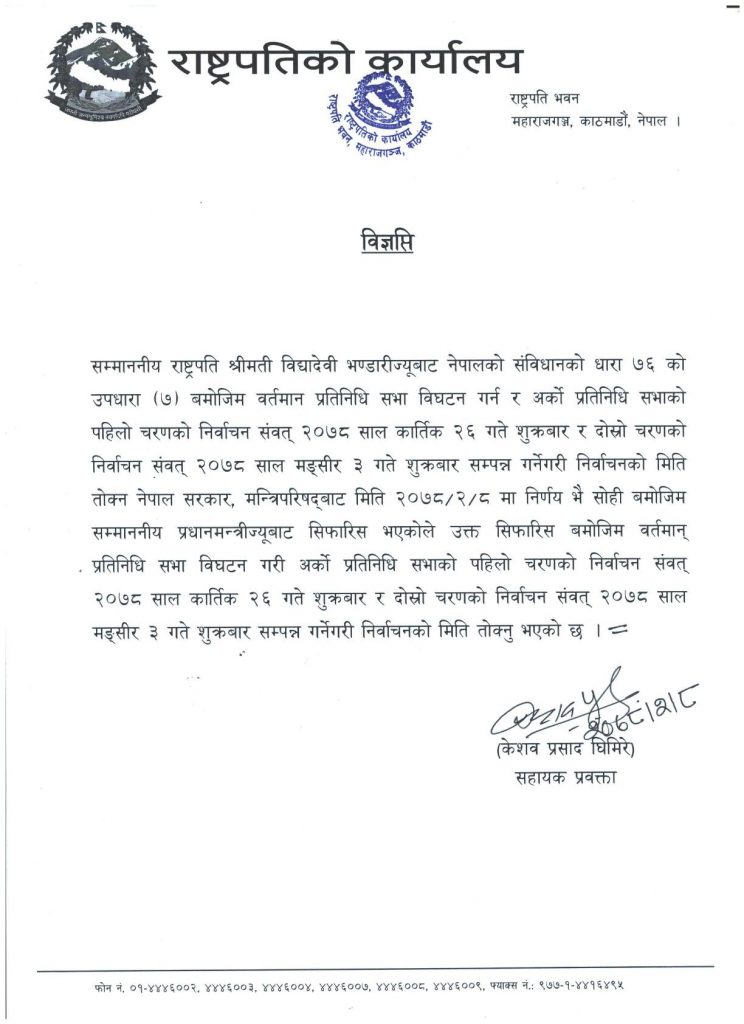 काठमाडौं । मन्त्रिपरिषद्को सिफारिशमा राष्ट्रपति विद्यादेवी भण्डारीले मध्यरातमा प्रतिनिधिसभा विघटन गरेर मध्यावधि चुनाव घोषणा गर्नुभएको छ । प्रतिनिधिसभा सदस्यका लागि चुनाव कात्तिक २६ र मंसिर ३ गते गरी दुई चरणमा हुनेछ ।