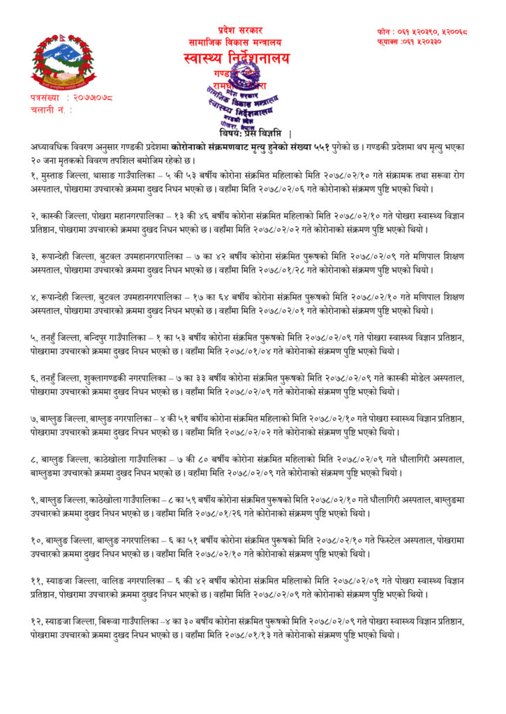 निर्देशनालयका अनुसार प्रदेशमा कोरोना संक्रमणबाट निधन हुनेको संख्या ५ सय ५१ पुगेको छ ।