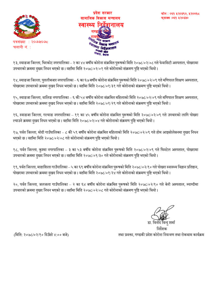 तनहूँ जिल्लाबाट मृत्यु हुनेहरु बन्दिपुर गाउँपालिका वडा नं. १ का ५३ बर्षिय पुरुष र अर्का शुक्लागण्डकी नगरपालिका वडा नं. ७ का ३३ बर्षिय पुरुष रहेको स्वास्थ्य निर्देशनालय पोखराले जनाएको छ ।
