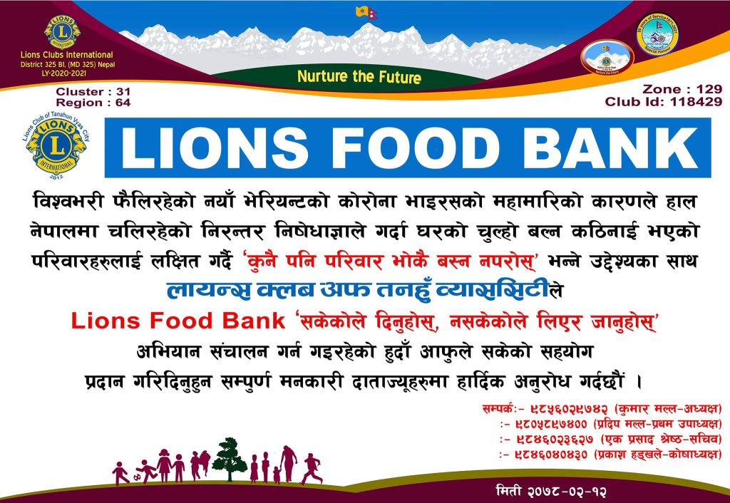 लायन्स क्लब अफ तनहूँ व्यास सिटीले उपलब्ध गराएको खाद्य सामाग्रीहरुमा १० केजी चामल, १ केजी दाल, १ केजीकाउली, १ केजी नुन, १ केजी क्वाटी, १ पोका सोयाविन, १ पोका तेल, १ पोका तरकारी, १ वटा सावुन २५ पिस मास्क रहेको छ ।