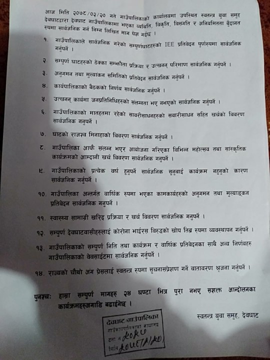 युवाहरुले पेश गरेको मागपत्रमा देवघाट गाउँपालिकाका मुख्य घाटहरुबाट अमानतमा जथाभावी नदीजन्य सामाग्रीहरुको उद्खनन् भैरहेकोले तत्काल रोकी आ इ इ प्रतिवेदन सार्वजनिक गर्नुपर्ने, हाल उद्खनन् गरिरहेको ठेक्का सम्झौता र उत्खनन् गरेको परिमाणको सार्वजनिक गर्नुपर्ने माग रहेको छ।