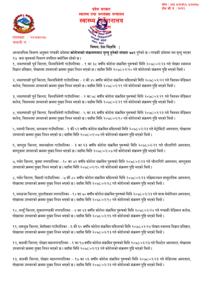 प्रदेश स्वास्थ्य निर्देशनालय पोखराका अनुसार मृतकहरु कास्की जिल्लाका ६ जना, नवलपुर जिल्लाका ४ जना, स्याङ्जा जिल्लाका १ जना, पर्वत जिल्लाका २ जना, बाग्लुङ जिल्लाका १ जना, म्याग्दी जिल्लाका १ जना, तनहूँ जिल्लाका १ जना (माथी उल्लेखित) र लमजुङ जिल्लाका १ जना रहुभएको छ ।
