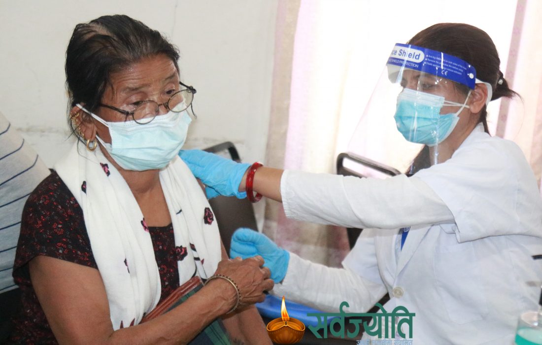 तनहूँ । कोभिड १९ को महामारीले दिनरात नभनिकन सर्वसाधारणको सेवामा खटिईरहनुभएकी व्यास नगरपालिकाकी एक जना स्वास्थ्यकर्मी बृद्धालाई कोभिड बिरुद्धको खोप लगाउने तयारी गर्दै । (फाईल तस्विर)