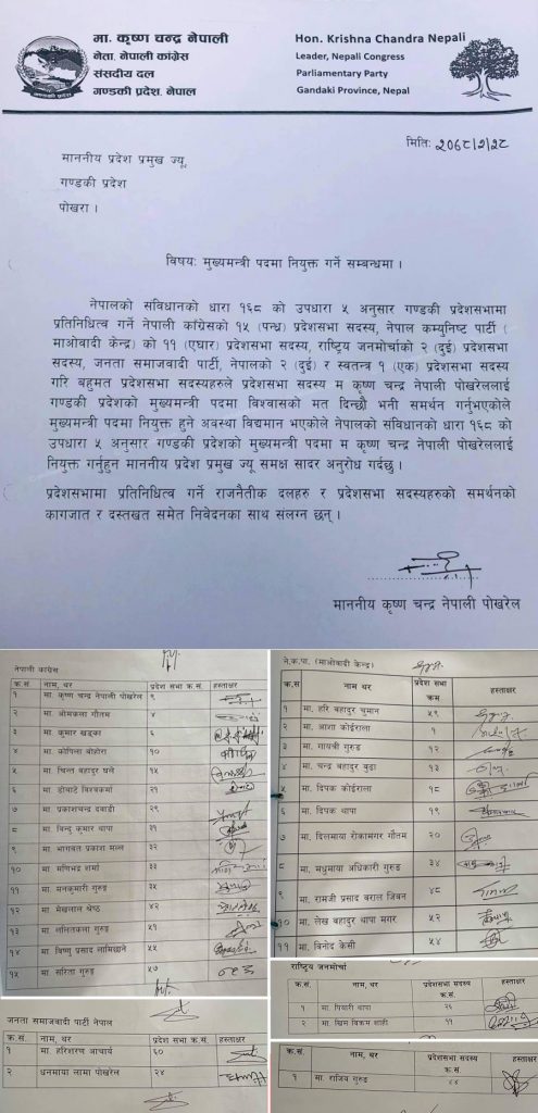 बहुमत सांसदको हस्ताक्षरसहित नेपाली कांग्रेसका सांसद कृष्णचन्द्र नेपाली पोखरेलले गण्डकी प्रदेशमा मुख्यमन्त्रीमा दावी पेश गर्नुभएको छ । गण्डकी प्रदेश प्रमुख सीताकुमारी पौडेलसमक्ष उहाँले दावी पेश गर्नुभएको छ ।