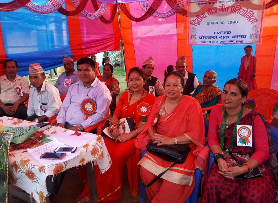 २०७४ सालमा व्यास नगरपालिका वडा नं. ९ माझफाँटमा आयोजित द्धितिय तीज गीत प्रतियोगितामा मंचमा आसिन गण्डकी प्रदेश सभा सदस्य सरिता गुरुगं, व्यास ९ का अध्यक्ष सुरेश थापा लगायत अन्य अतिथि महानुभावहरु । (फाईल तस्विर)