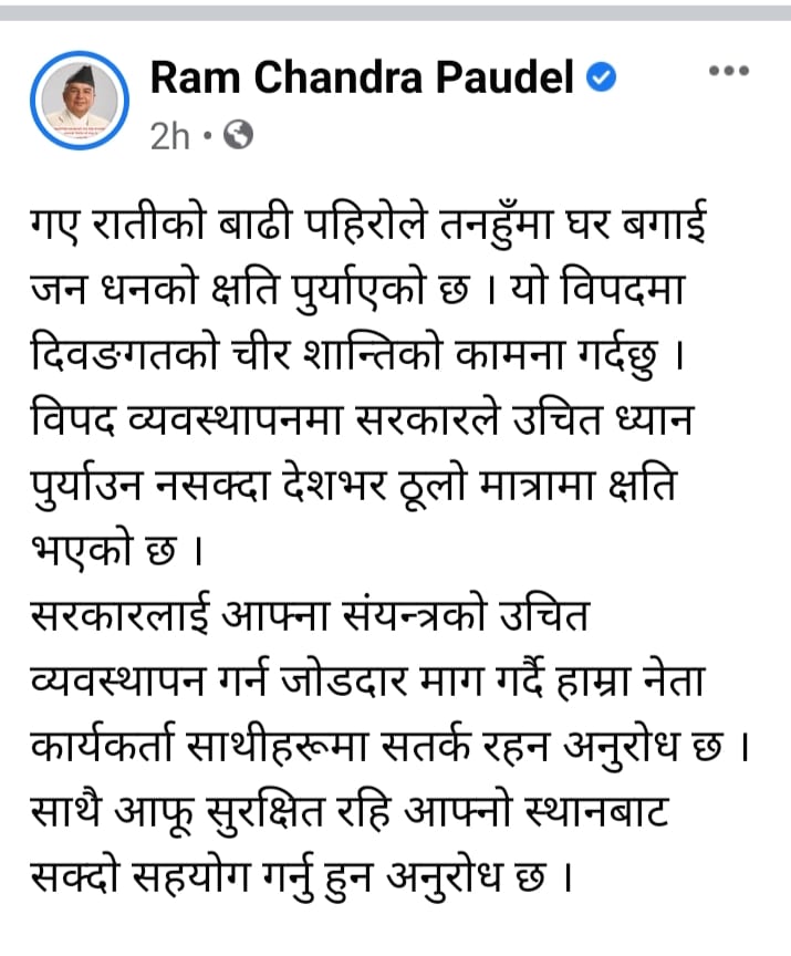 नेपाली कांग्रेसका वरिष्ठ नेता रामचन्द्र पौडेलले विपद व्यवस्थापनमा सरकारले उचित ध्यान पुर्याउन नसक्दा देशभर ठूलो मात्रामा क्षति भएको बताउनुभएको छ । उहाँले गए रातीको बाढी पहिरोले तनहूँमा घर बगाई जन धनको क्षति पुर्याएकोमा दिवङगतको चीर शान्तिको कामना गर्दै सरकारलाई आफ्ना संयन्त्रको उचित व्यवस्थापन गर्न जोडदार माग गर्नुका साथै आफ्ना नेता कार्यकर्ता साथीहरूमा सतर्क रहन अनुरोध गर्नुभएको छ । साथै आफू सुरक्षित रहि आफ्नो स्थानबाट सक्दो सहयोग गर्नु हुन अनुरोध छ भन्ने व्यहोराको विज्ञप्ति सामाजिक संजालमा लेख्नुभएको छ ।