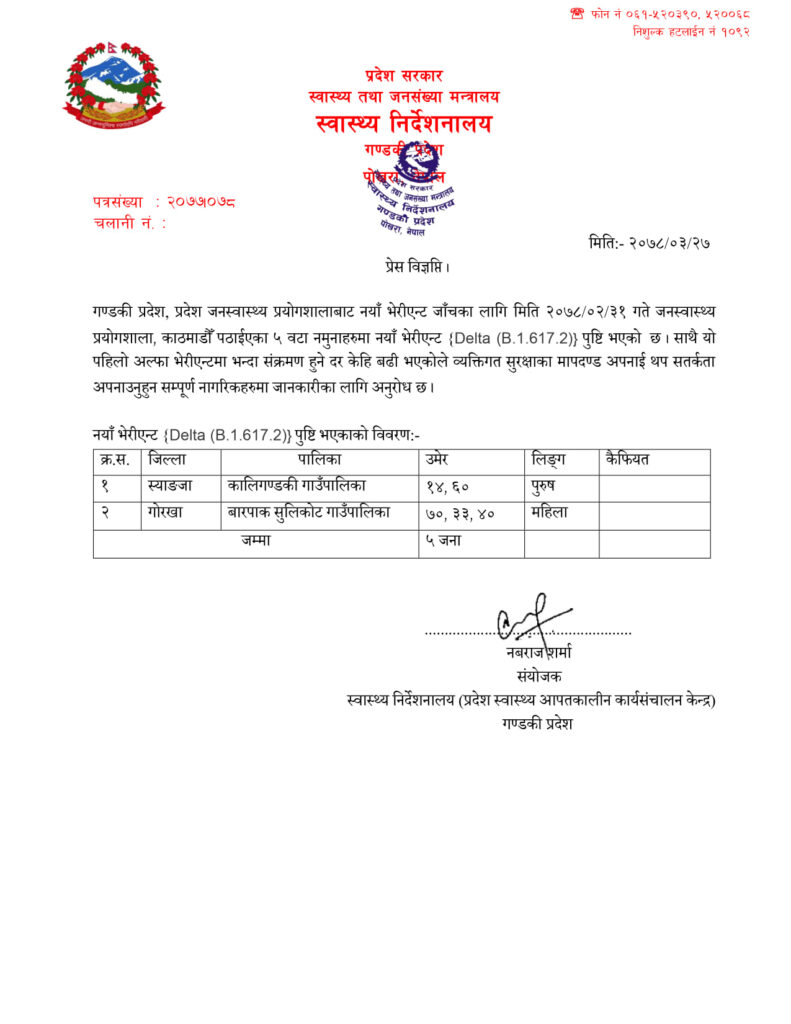 प्रदेश स्वास्थ्य निर्देशनालय पोखराले आज जारी गरेको विज्ञप्ति अनुसार ती जिल्लामा नयाँ भेरियन्ट डेल्टा बि.१.६१७.२ भएको पुष्टि भएको छ ।